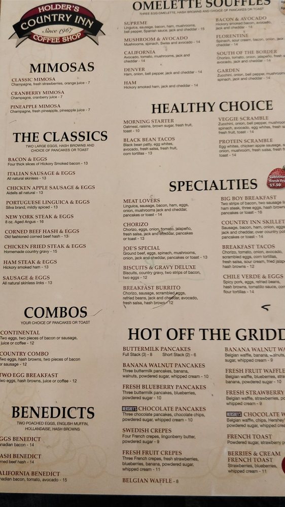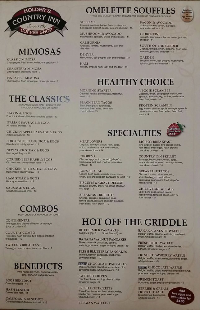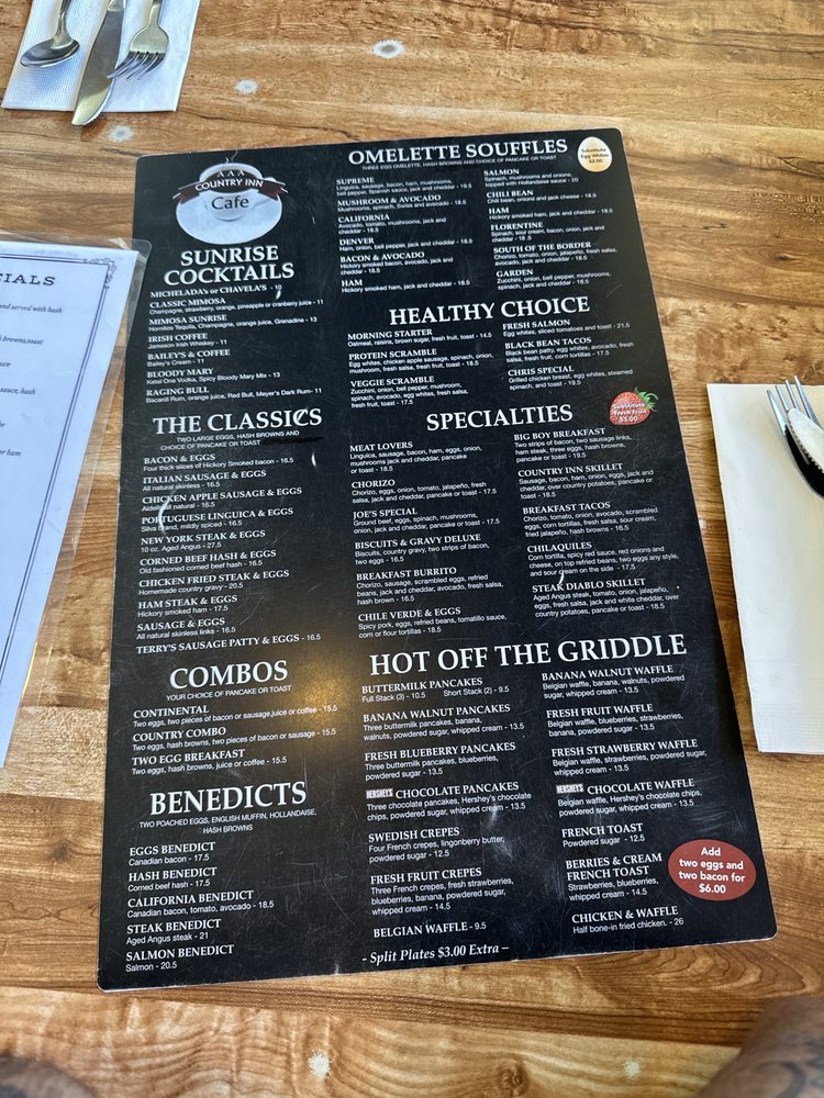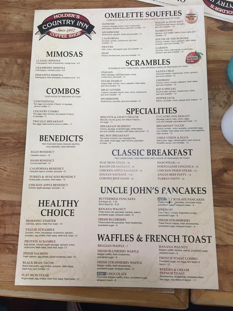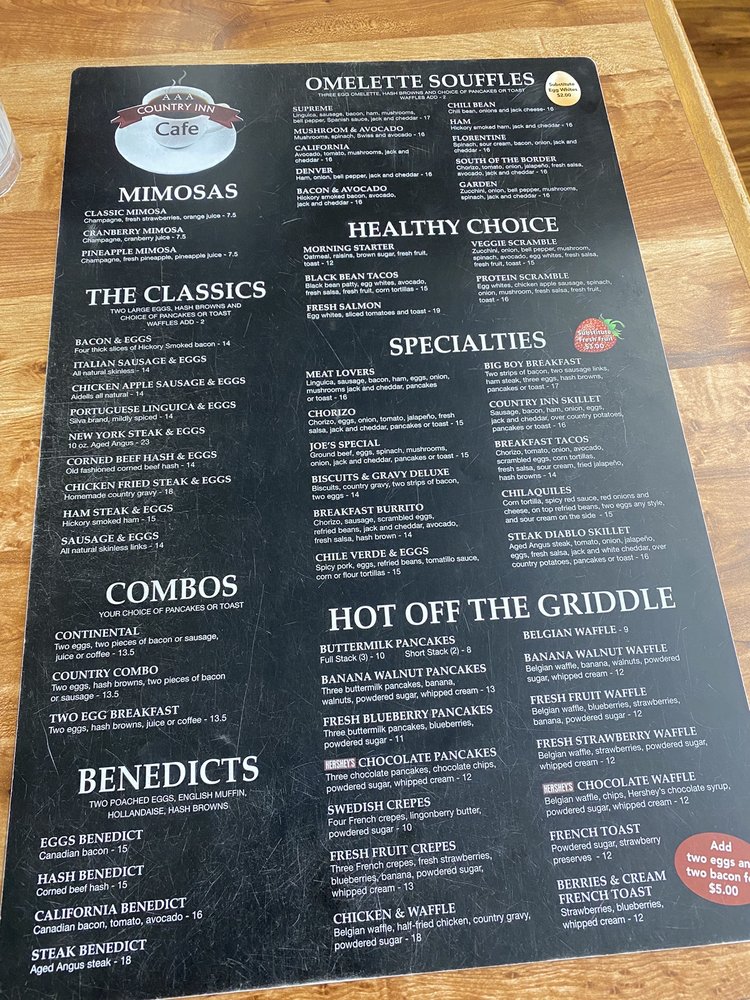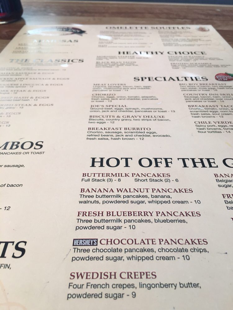 Sausage, bacon, ham, onion, eggs, Jack and cheddar, over country potatoes, pancakes or toast.