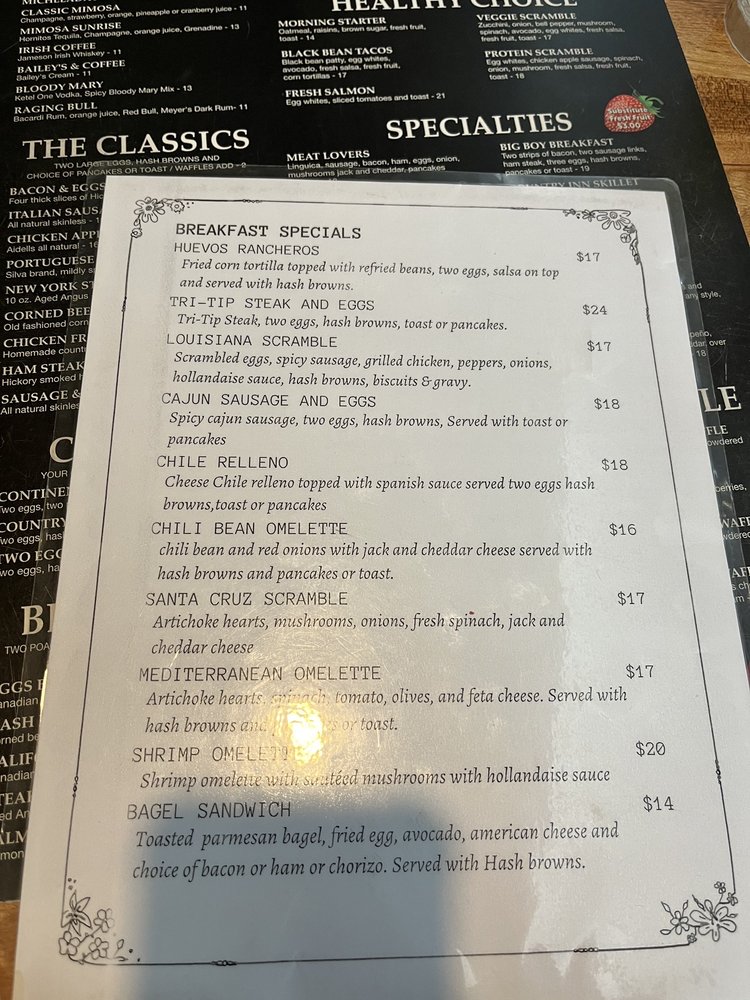 Aged angus steak, tomato, onion, jalapeno, eggs, fresh salsa, Jack and white cheddar, over country potatoes, pancakes or toast.