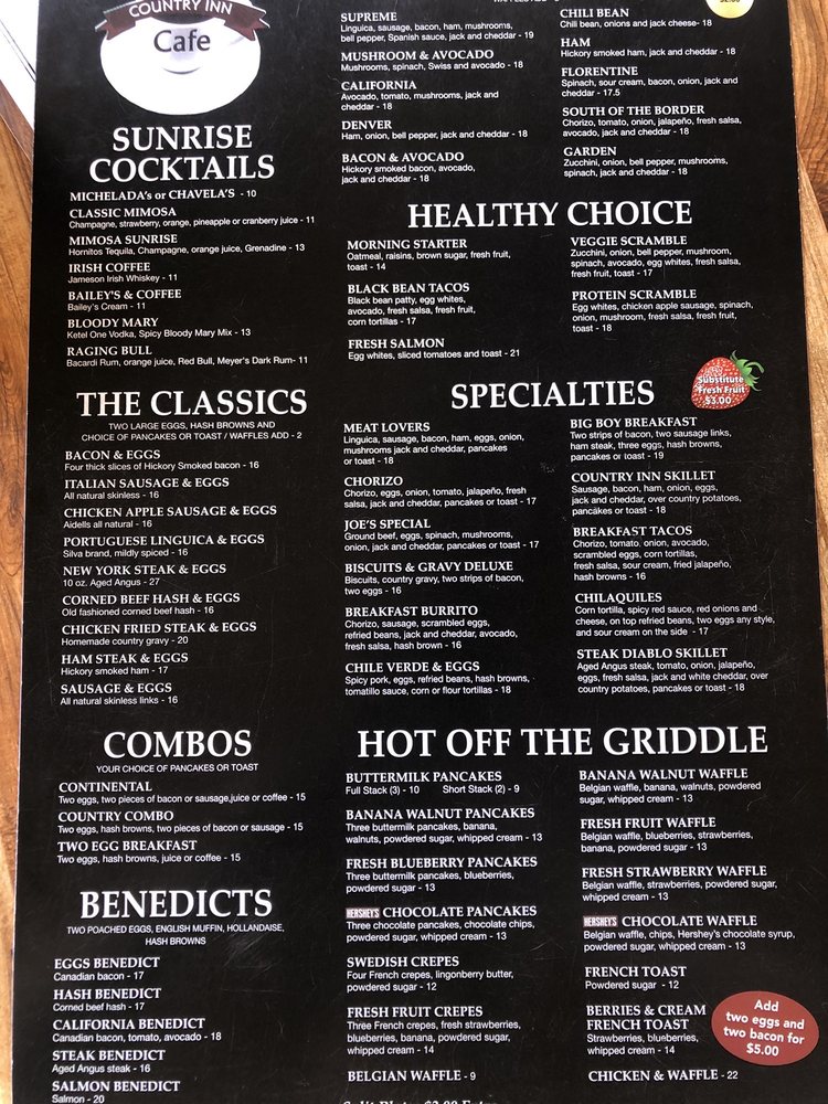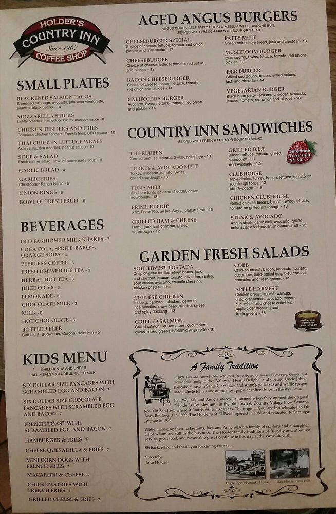 Country Inn Cafe, located in San Jose, CA, offers a diverse menu for breakfast, brunch, and lunch. The cafe provides a cozy and casual atmosphere, perfect for families and groups. Customer reviews praise the friendly service, spacious outdoor patio, and delicious food options. Highlights include the Apple Harvest Salad, Southwest Tostada Salad, Chicken Tenders and Fries, Aged Angus Burgers like the Patty Melt and Bacon Cheeseburger. The cafe also offers vegetarian options like the Mushroom Burger and fresh fruit bowls. With a focus on comfort food and classic American dishes, Country Inn Cafe is a great spot for a relaxing meal with friends and family. The restaurant's convenient location, extensive menu, and excellent service make it a must-visit destination in the San Jose area.