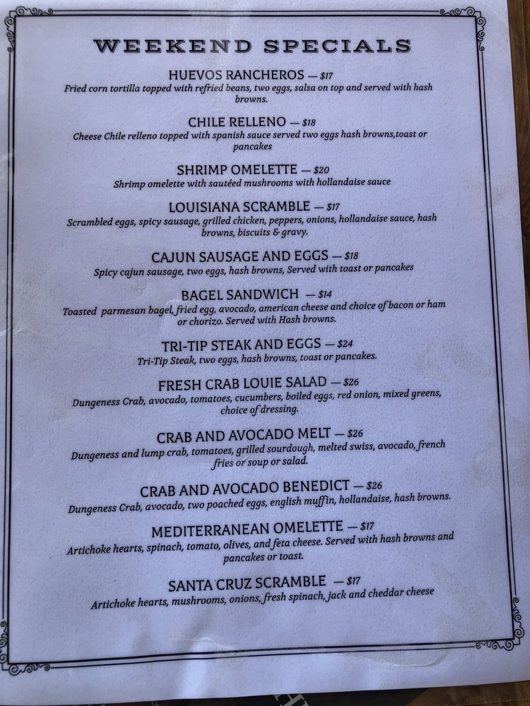 Linguica, sausage, bacon, ham, eggs, onion, mushrooms jack and cheddar, pancakes or toast.